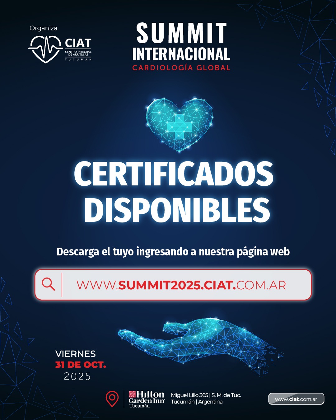 El Centro Integral de Arritmias de Tucumán agradece profundamente a todos los profesionales, disertantes y asistentes que formaron parte del SUMMIT Internacional de Cardiología Global 2025. Ya se encuentran disponibles los certificados para su descarga en el sitio oficial.